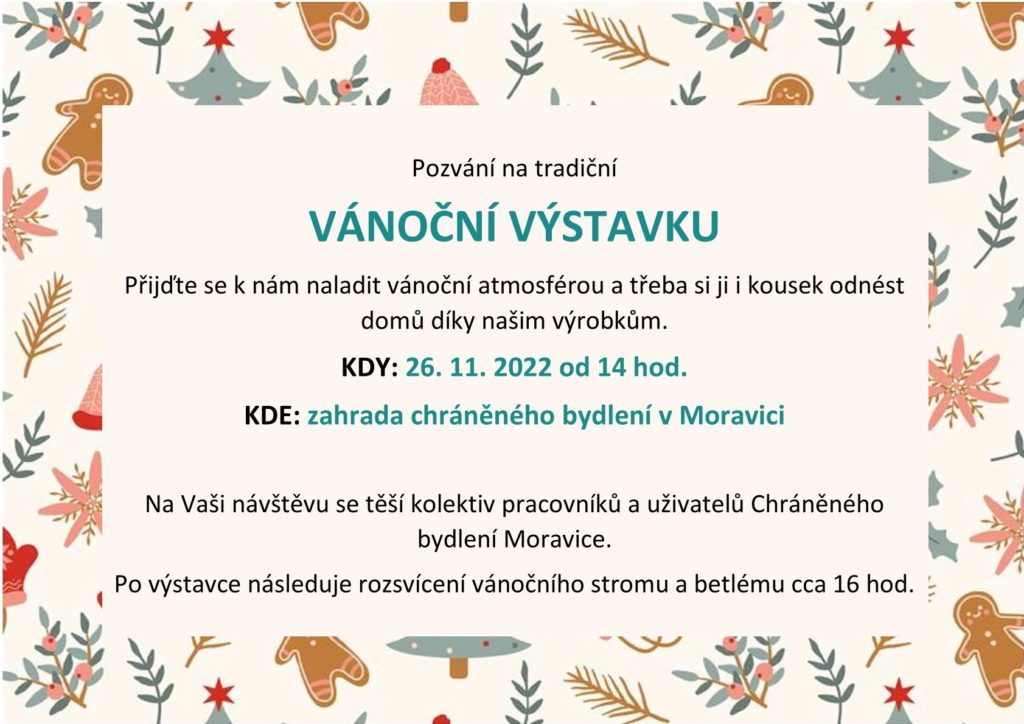 Chráněné bydlení Moravice pořádá v sobotu 26.11. 2022 od 14:00 vánoční výstavku, od 16:00 následuje rozsvícení vánočního stromu a betlému. Podrobnější info v obrázku níže.